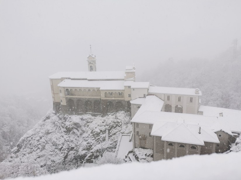Quel beau cadeau ce matin… Il neige sur le lac Majeur… Seul inconvénient, on ne voit plus le lac pour vous le montrer… Alors laissons travailler l’imagination pour redessiner le lac dans le paysage…