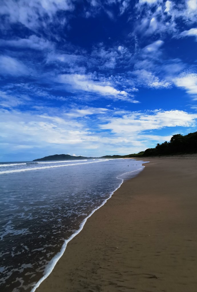 Vous savez combien j’aime faire durer les plaisirs et partager quelques bribes avec vous. Me voici rentrée à la capitale après une semaine d’immersion dans une nature sauvage bienfaitrice. Les batteries sont rechargées, mais ouvrons encore un peu la fenêtre vers quelques paysages. J’étais au nord-ouest sur la plage très bien nommée Playa Grande. Alors, quand le courage diminuera, je repartirai en pensées pour une de mes longues promenades matinales sur le sable. L’énergie du 1er jour me fit aller jusqu’au bout de la plage, ayant droit aux félicitations de mon téléphone pour les 14’093 pas parcourus, entrecoupés il est vrai de quelques plongeons rafraîchissants… et tout ça avant le petit-déjeuner.