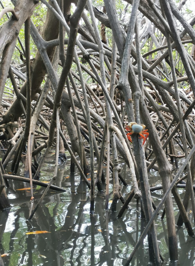 Les palétuviers sont impressionnants mais surtout fort utiles. Ces arbres sont les seuls capables de pousser avec les pieds dans l’eau salée et de s’adapter à la fluctuation des marées. Ils font partie d’un écosystème particulier appelé la mangrove, un genre de végétation que je n’avais jamais visité. C’est une véritable forêt amphibie dans laquelle on ne peut se déplacer qu’en bateau. Cela forme une barrière naturelle entre la terre et la mer qui permet de limiter les dégâts en cas de tempêtes, d’ouragans voire même de tsunami, une vraie richesse écologique quoi ! Sur les racines de ces arbres on peut y voir un ballet constant de crabes aux couleurs éclatantes.