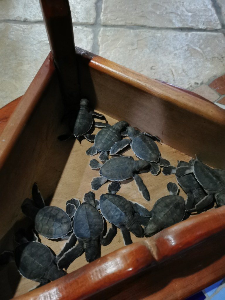 Un soir, notre guide nous a appelés pour nous montrer les bébés tortues qui avaient été récupérés. Alertés parce qu’ils s’étaient égarés dans les jardins de l’hôtel, ils les ont ramenés sur la plage. Impossible de les mettre à l’eau, cela aurait complètement chamboulé leur système d’orientation (GPS naturel), nous a expliqué le guide. Chaque tortue revient pondre sur la plage où elle est née, raison pour laquelle elles doivent absolument mémoriser le lieu exact en arrivant par elles-mêmes jusqu’à la mer.