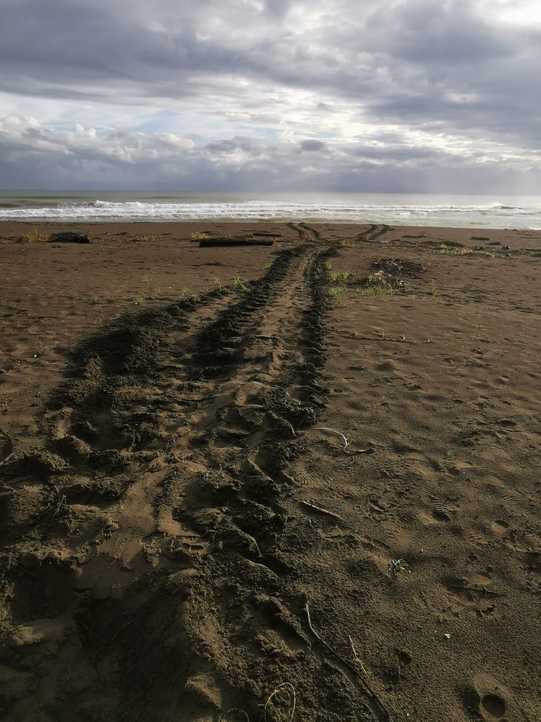 Grande est mon admiration pour dame tortue ! Non ce ne sont pas des traces de voiture que vous voyez sur la photo, mais bien le sillage du passage d’une tortue marine pour aller pondre ses œufs avant de s’en retourner vers sa grande baignoire.