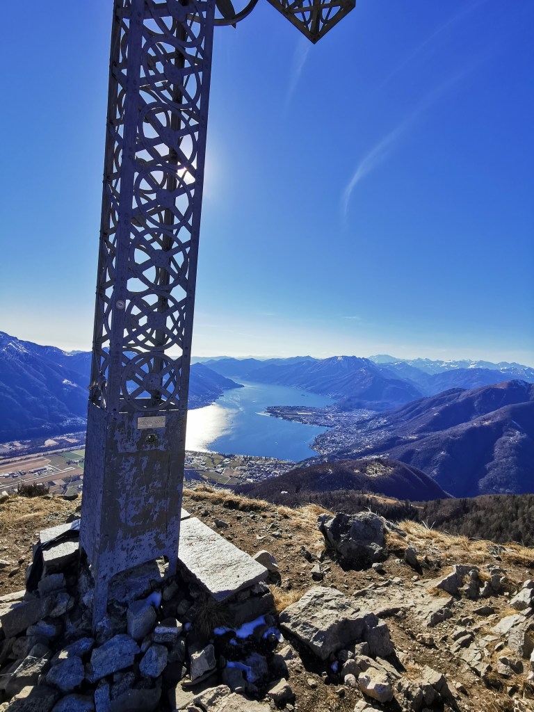 Dis, tu crois que c’est le Weissmies ? Et puis on devrait voir le mont Rose aujourd’hui, non ? Il n’y a pas à dire plus c’est haut plus c’est beau. Depuis le sommet du Sassariente (1767 mètres), nous contemplons la chaîne des Alpes grâce à un ciel limpide. À nos pieds, le lac Majeur s’étire vers l’Italie. Vu la température, j’imagine les nombreux touristes sur les quais et les terrasses de Locarno et Ascona.