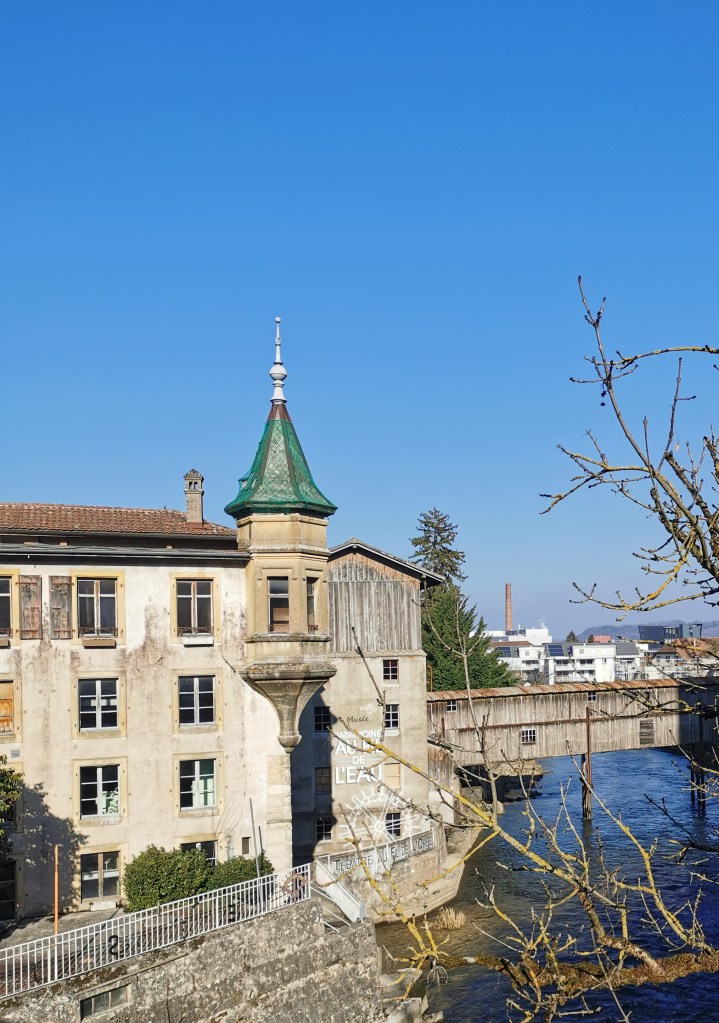 Comme j’aime me promener avec les yeux d’une étrangère venue d’ailleurs, c’est toujours un brin étrange quand on découvre sa région avec un regard de touriste. Malheureusement, je découvre ce musée trop tard sur les rives de l’Orbe puisqu’il a été fermé, le propriétaire désirant créer des appartements dans ce bâtiment historique. C’était le temps où l’énergie était un problème local, on savait placer les moulins au bord des rivières (ou là où il y avait beaucoup de vent) afin d’utiliser une énergie gratuite tout en laissant l’eau (ou l’air) continuer sa course après qu’elle (ou il) ait actionné quelques mécaniques. Dommage, je ne saurai pas ce que cache ce pont de bois couvert, alors je lui imagine quelques jours de gloire, je lui invente une légende digne du célèbre pont de bois de Lucerne, avec une touche plus industrielle qu’aristocratique.