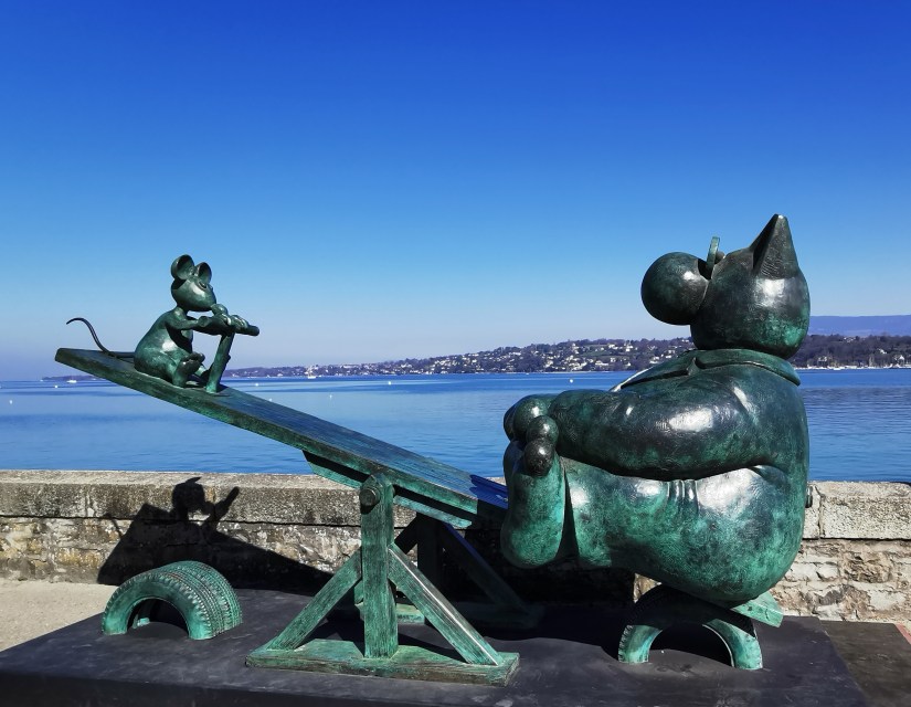 Sympathiques rencontres l’autre jour à Genève ! Si vous aimez l’humour du Chat, allez y faire un tour, ça miaule du côté de la rade, les chats ont envahi le quai Wilson, cinquante tonnes de chats. Allez regarder comment le Chat joue de la flûte à bec… Bravo monsieur Geluck, faire rire est un art, j’aime bien cette jolie folie !