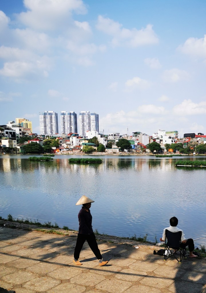 Chaque petit lac semble avoir son art de vivre et ses pêcheurs. Le lac Thanh Nhàn est charmant… Mais le plus grand évènement de la journée explique mon enthousiasme : j’ai vu le ciel bleu au-dessus d’Hanoï… eh oui, c’est possible, je pensais que j’étais condamnée à noyer mon regard dans la grisaille du smog. Ainsi cela prouve que la pluie d’hier a nettoyé les nuages.