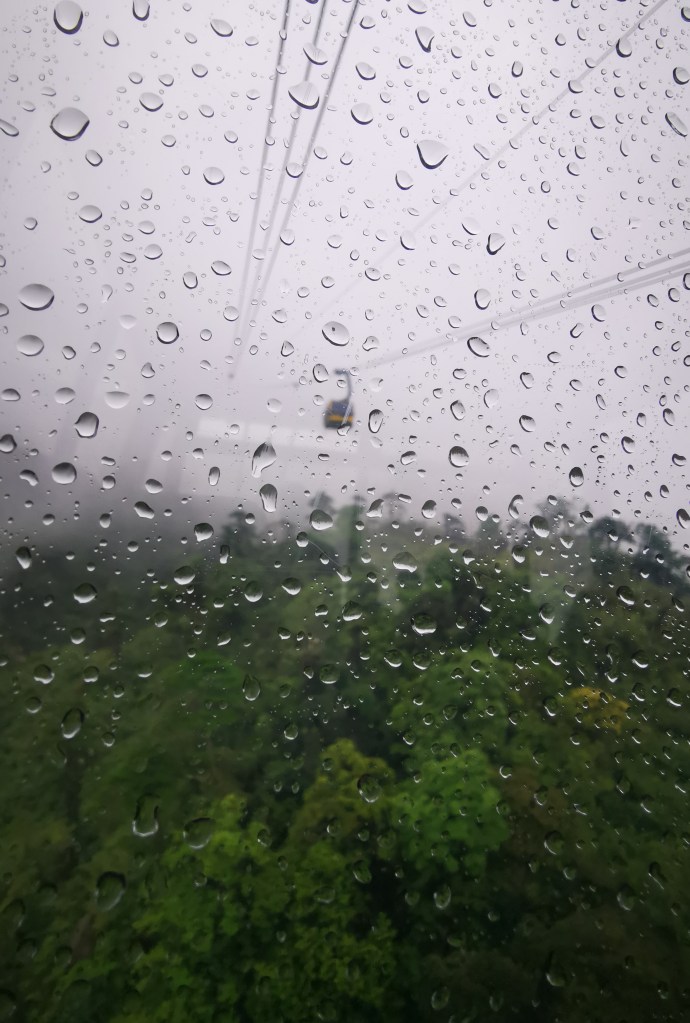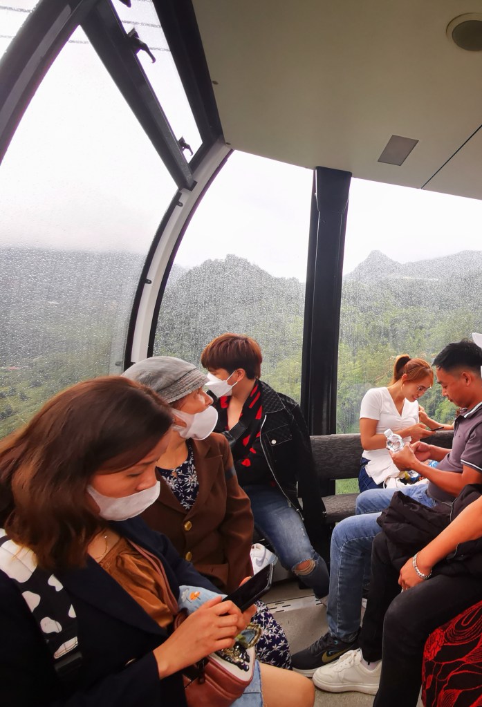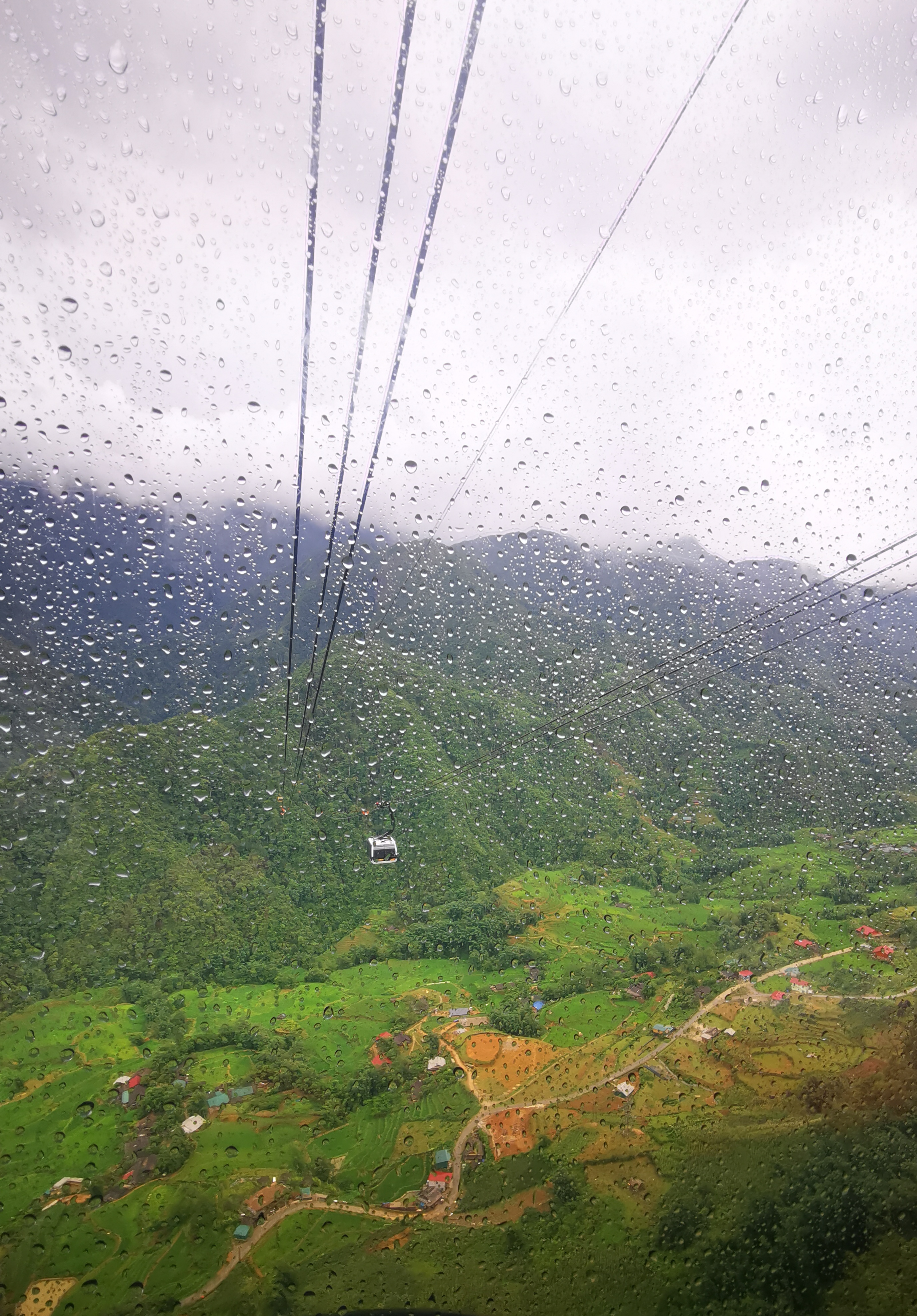 Le dernier jour de mon séjour à Sapa, j’ai compris pourquoi il y avait une telle explosion de constructions dans la ville. Malgré le temps maussade et une visibilité vraiment pas géniale, j’ai décidé de monter voir ce fameux téléphérique dont tout le monde parlait, pour monter au Fansipan, le toit du Vietnam, haut de 3143 mètres. Bien que la météo ne fût pas au rendez-vous, nous étions nombreux à avoir eu la même idée. Pour arriver au départ des cabines, il faut prendre un funiculaire qui a été construit pour donner l’impression de voyager dans le temps, même si les infrastructures sont super modernes. Un wagon avec des bancs en bois, comme nos chemins de fer de montagne des temps passés, nous hisse jusqu’à la station de départ. Le téléphérique a été inauguré en février 2016. Il montre bien le désir du pays de se propulser en avant sur la scène internationale, puisqu’il cumule deux records du monde du Guinness Book : un pour être le plus long téléphérique à trois câbles sans arrêt du monde, sur 6,3 kilomètres, et l’autre pour la plus grande différence d’altitude (1410 mètres) entre deux stations.