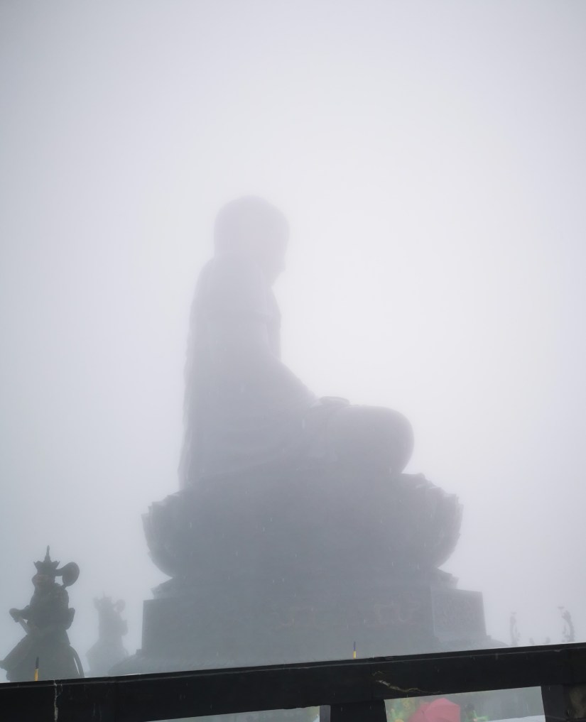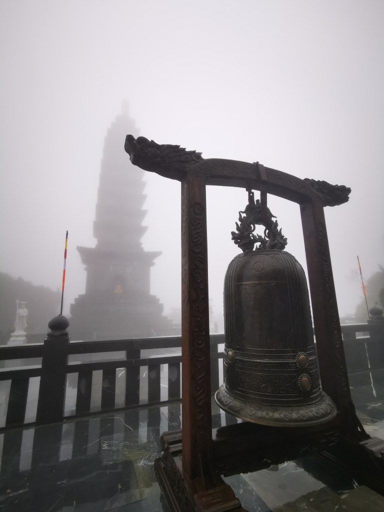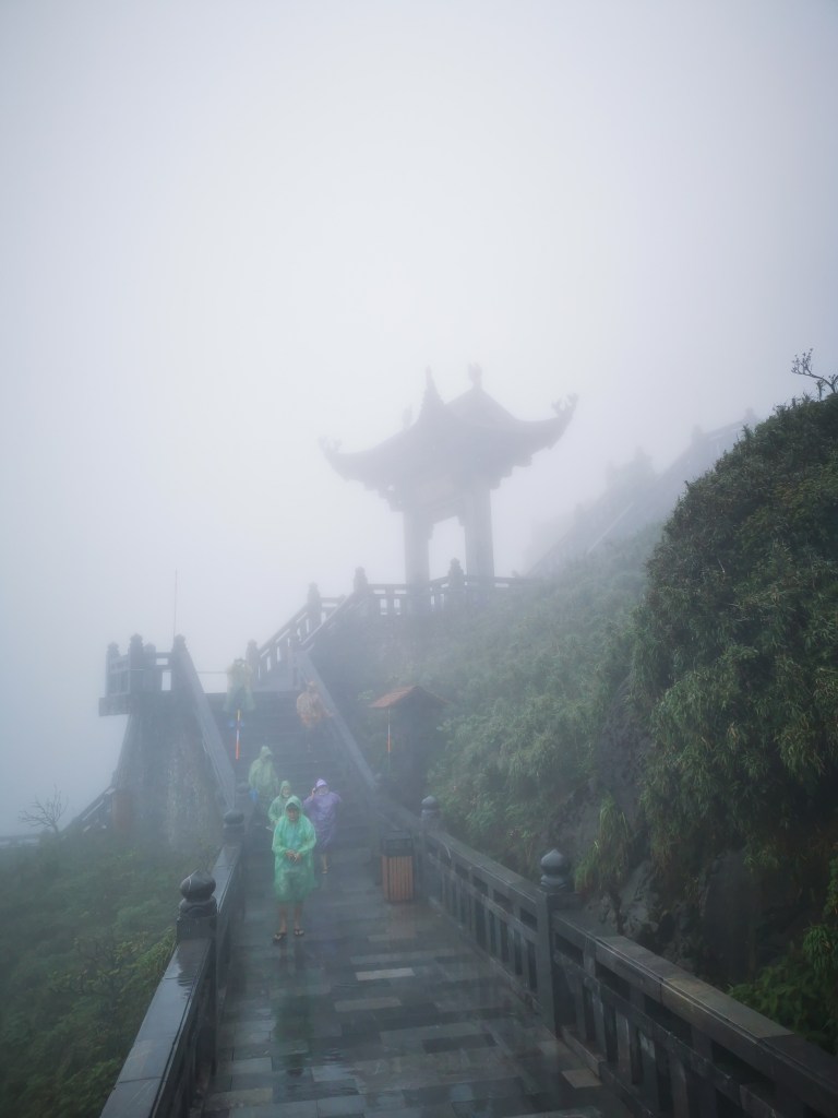 À peine sortie du téléphérique, je regarde avec interrogation la longue file des gens qui ont choisi d’aller jusqu’au sommet avec le funiculaire. Eh oui, il semble que cette masse touristique se protège de tout effort pour atteindre le toit du Vietnam. Je préfère me faufiler dans le brouillard qui insuffle une atmosphère mystique aux lieux. En grimpant sur les hautes marches, je tente d’imaginer le décor…