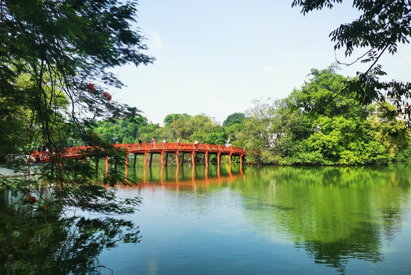 Lundi matin, c’est mon jour de congé, je sors plus tard pour ma promenade quotidienne autour de mon lac préféré. J’aime bien ce petit pont rouge en bois qui mène au temple Ngoc Son. Son nom : Thê Húc, veut dire « Soleil levant », voilà certainement pourquoi l’énergie y est si bonne tôt le matin. Le pont original datait de 1865, mais il a été reconstruit en 1952 avec une base en ciment. À mes yeux, c’est le petit Golden Gate d’Hanoï.