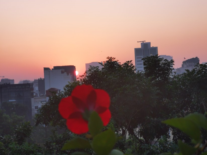 Un nouveau jour rougeoyait le ciel du matin. Le feu du soleil embrasait l’horizon. Le temps suspendait sa mesure. Puis la fleur apparut et éclata de rouge, épanouie devant l’aurore, réjouie d’un si beau matin pour éclore… Elle embrassait l’instant présent et s’en émerveillait.