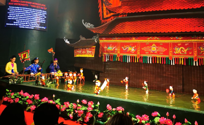 Enfin un samedi de libre qui me permet d’aller dans le joli petit théâtre près du lac. Vous le savez, tous ce qui est aquatique m’attire, alors pourquoi pas le théâtre des marionnettes sur l’eau ? Une forme d’art traditionnel avec une identité culturelle spécifique au Vietnam, des scènes de la vie quotidienne des villageois, des légendes, des mythes et des scènes historiques, c’était vraiment charmant.