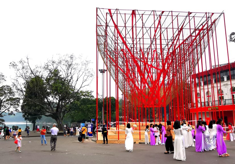 Si je veux de la couleur et des fleurs, c’est toujours autour du lac numéro 1 que je retourne. C’est un sport national que de se faire photographier près du lac Hoan Kiem en habit de cérémonie, surtout les femmes, vêtues d’áo dài (une robe et un pantalon de soie) qui posent devant les objectifs des professionnels ou des amateurs. Le week-end la route qui encercle le lac est fermée à la circulation et il y a chaque fois des animations différentes, cette semaine c’était un festival artistique.