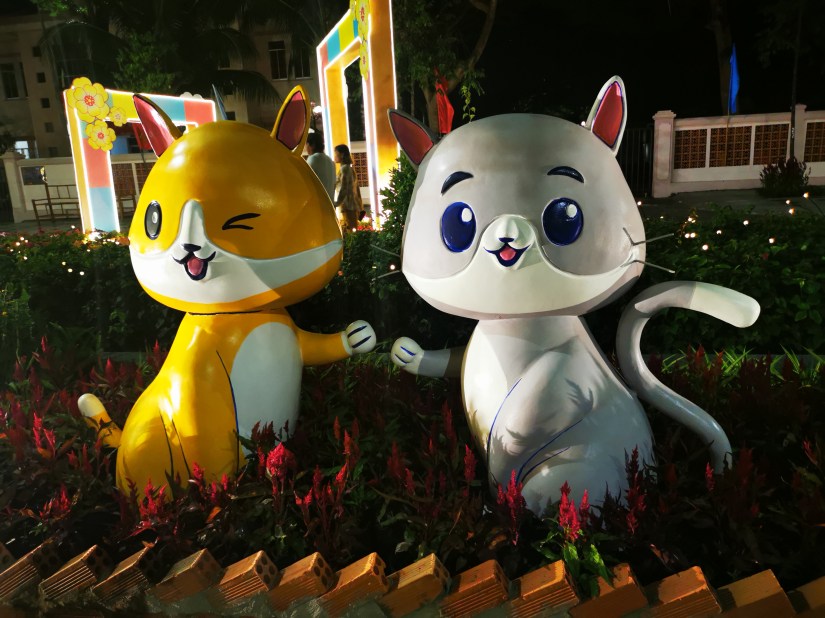 Eh oui, comme en Chine et dans beaucoup d’autres endroits, on a fêté la nouvelle année cette nuit. Si pour tous les autres pays, on entre dans l’année du lapin, au Vietnam, ce sera l’année du chat. Espérons que cela ressemblera à un doux ron-ron.