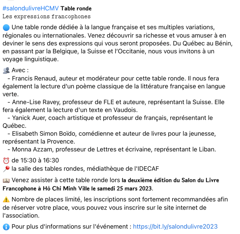 Samedi prochain durant le 2ème festival du livre francophone, je participerai à une table ronde autour des expressions francophones pour représenter la Suisse à Ho Chi Minh, à côté du Québec, de la Provence et du Liban.