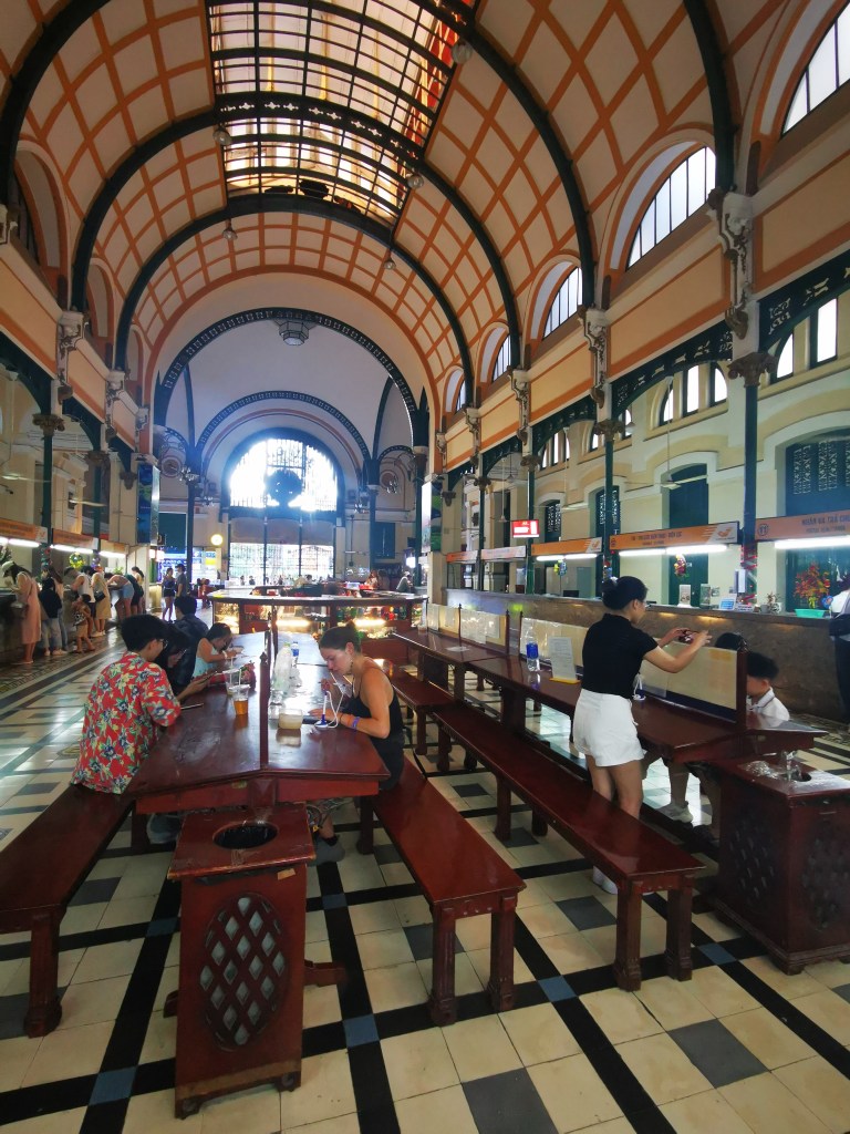 Allez, suivez-moi, je vous emmène à la poste de Saïgon, inaugurée en 1863 au temps de l’Indochine. C’est un des plus vieux bâtiments coloniaux de la ville et naïvement je croyais que c’était un musée, tant l’architecture y est impressionnante. Pourtant c’est une vraie poste, la plus grande du pays, d’où l’on peut envoyer lettres et colis. Je me serais volontiers assise sur ces bancs pour écrire quelques missives, mais voilà, plus personne n’écrit de vraies lettres et moi je n’aime pas les correspondances à sens unique, enfin sauf quand je comprends pourquoi on ne me répond pas (comme cette chère Comtesse). La seule personne qui m’écrivait a dû se mettre à la technologie parce que sur ses quatre lettres je n’en ai reçu qu’une seule depuis que je suis dans ce pays.