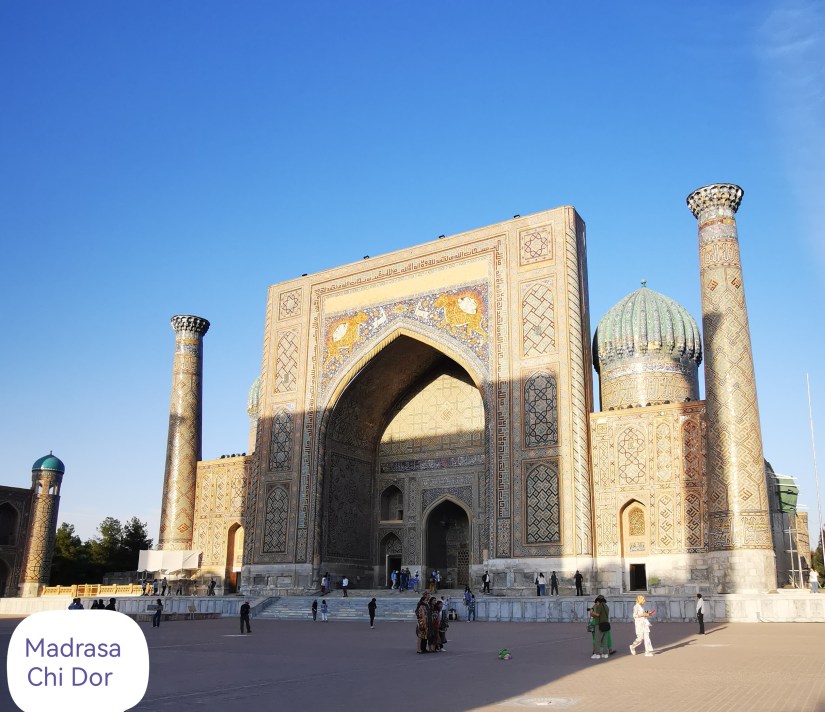 À l’Est de la place, la madrasa Chi Dor me fascine rien qu’à l’idée que ma compatriote Ella Maillard, infatigable voyageuse, eut la chance d’être logée dans une des cellules accueillants les visiteurs de passage. Par contre, cet endroit fut moins hospitalier plus tard, puisqu’il servit de lieu de détention pour les musulmans qui s’opposaient au pouvoir soviétique.