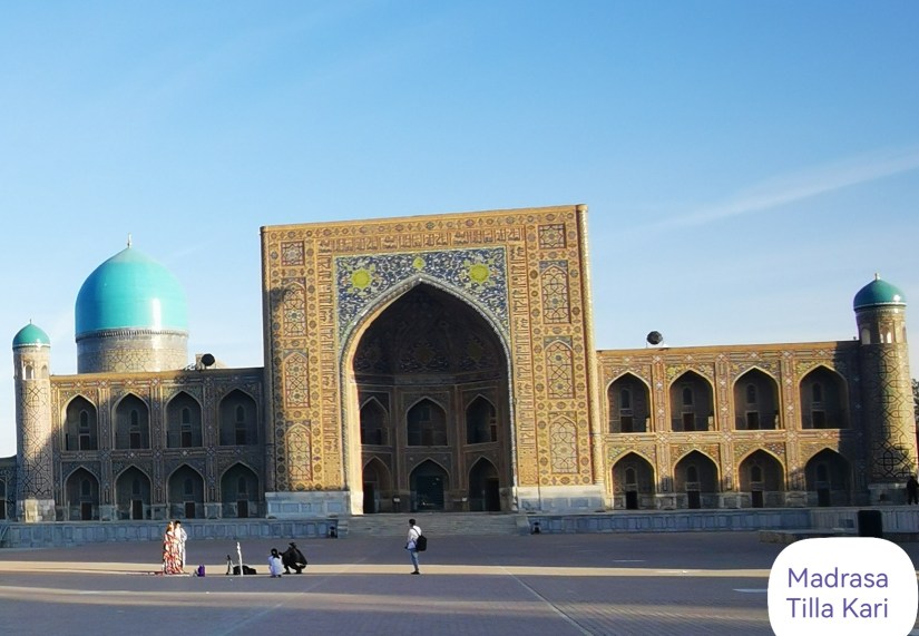La madrasa Tilla Kari ( = couverte d’or) est la moins haute mais sa façade est la plus longue. C’est le monument le plus jeune de la place et c’est le seul à avoir des cellules donnant vers l’extérieur.