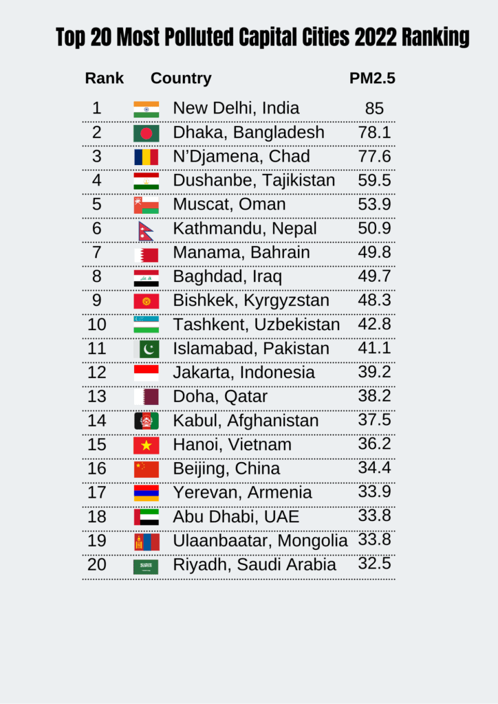 L’autre jour, je parlais des problèmes de sociétés avec une classe. Une étudiante, qui semblait concernée par l’écologie, a déclaré que l’Ouzbékistan (ou la ville de Tachkent j’ai oublié) était au premier rang pour la pollution. Alors, pour vérifier l’information, vu que j’avais connu pire, j’ai posé la question sur internet et suis tombée par hasard sur ce classement de 2022…