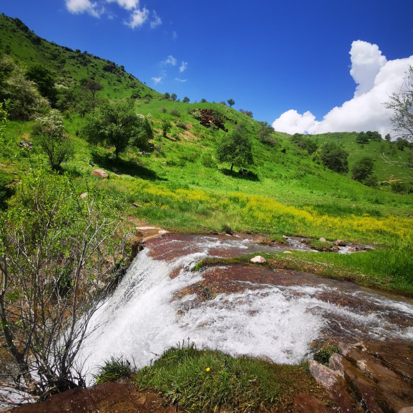 En attendant la Grande Nouvelle, j’ai renfilé mes chaussures de trek, happée par l’appel des montagnes et je suis allée boire à la source Nature… Quelques chutes d’eau le long d’une rivière, des troupeaux de vaches, chevaux, chèvres ou moutons, quelques ânes et chiens accompagnants les bergers, des coccinelles semblant danser sur les hautes herbes au rythme du vent, deux beaux oiseaux bleus perchés sur un arbre sec, un aigle (je crois) tout là-haut sur un rocher… Pas la moindre trace d’autres randonneurs, ce qui explique nos difficultés à trouver une trace et pourquoi très souvent il a fallu se faufiler à travers les broussailles agressives. Par contre, j’ai détesté l’odeur pestilentielle qui se répandait loin à la ronde près du cadavre d’une vache, probablement attaquée par un loup, a supposé notre guide. Heureusement, l’explosion de fleurs et de graminées ramenèrent à mon nez le doux parfum du printemps.
