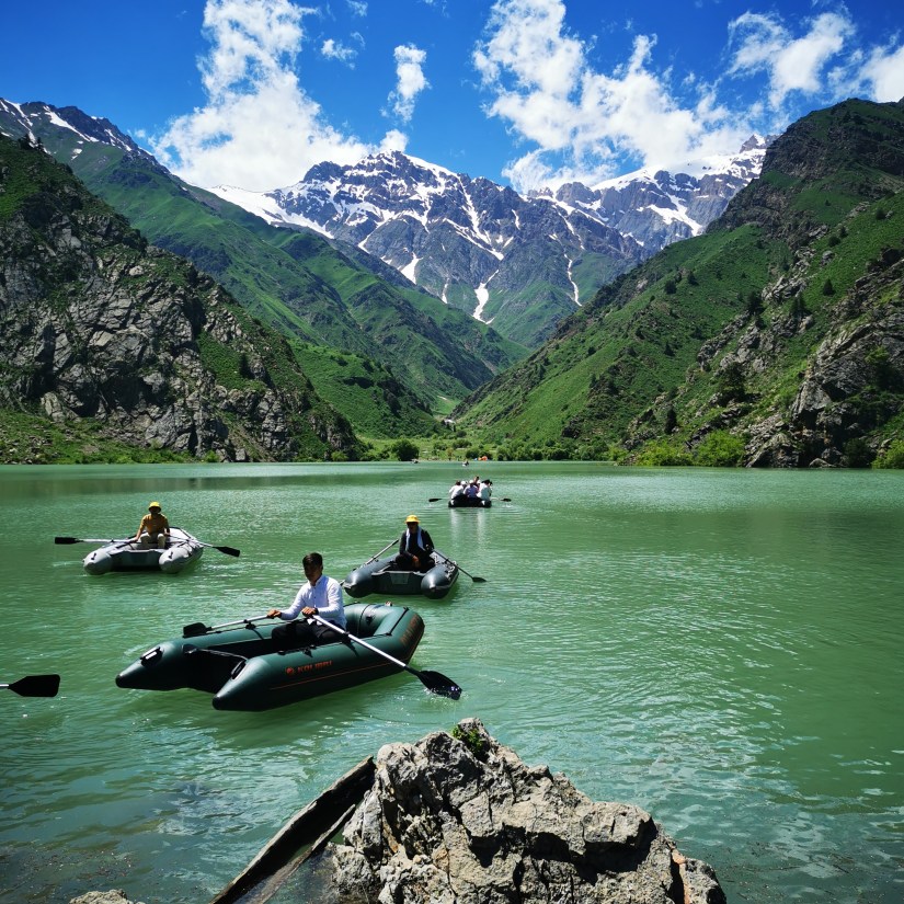 Maintenant, que le sentier est enfin libre de tout véhicule, la véritable randonnée pourrait commencer, me suis-je dit. Grâce à la présence d’un aimable juge ouzbek qui parle très bien l’anglais et trouve les mots pour appuyer mes arguments ma requête est acceptée. Dès que la photo de groupe est faite devant le lac, ceux qui le désirent se lancent à la conquête de l’autre lac Urungach. Il faut zigzaguer entre la foule mais dès que la pente devient raide et le chemin très caillouteux, il ne reste que les plus courageux. Des fois j’ai l’impression d’être comme un cheval à qui on vient d’enlever la bride et qui peut enfin galoper vers la liberté. Je m’élance bien décidée à ne plus m’arrêter avant de découvrir le paysage caché tout là-haut sur les rochers. Arrivés au bord du deuxième lac, le juge et ses amis proposent de le traverser sur une de ces embarcations. Bonne idée, car la belle prairie de l’autre côté semble bien plus confortable que ces gros rochers. Un randonneur qui nous entend parler anglais dit que c’est dangereux.