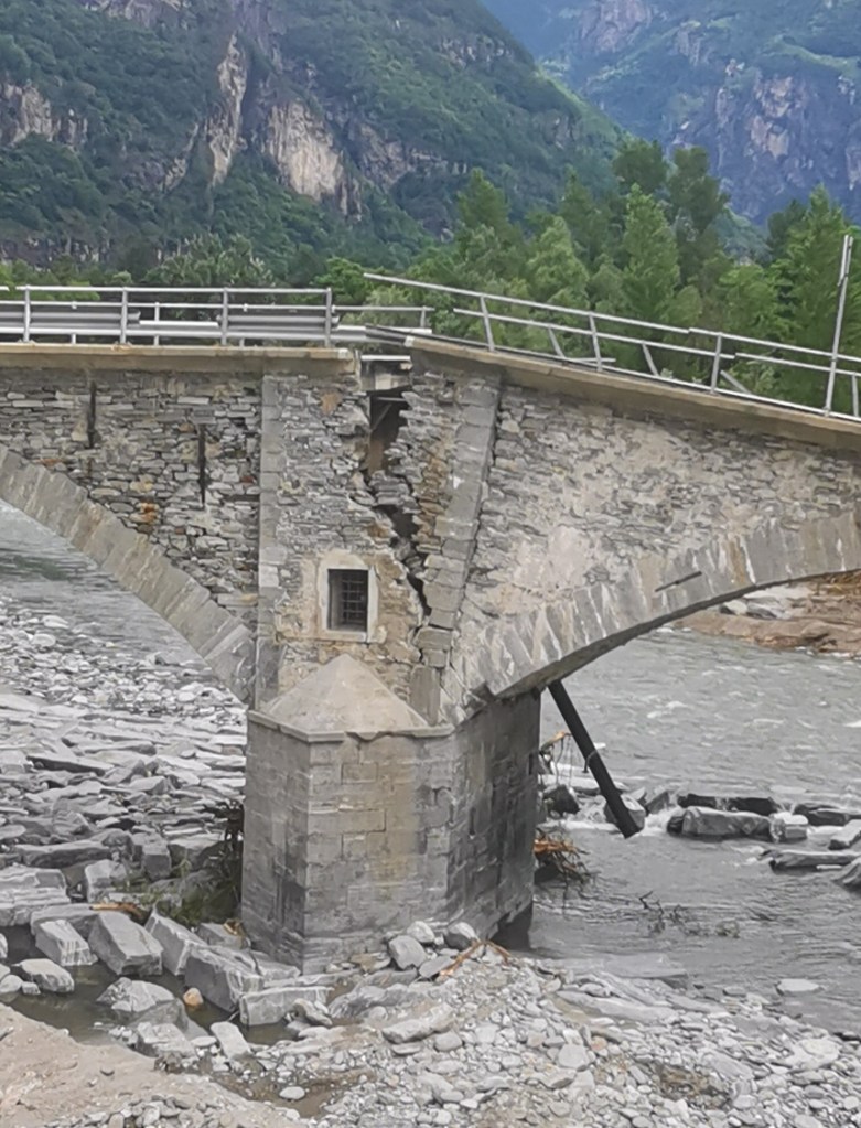 Même si j’ai déjà vu de nombreuses photos ou vidéos, quand je me trouve devant la réalité de ce désastre, j’en reste sans voix. Quelle chance dans ce malheur que le pont de la piste cyclable (sur lequel passait autrefois le petit train du Val Maggia) ait résisté. Ils sont en train d’y terminer les travaux de renforcement qui permettront de laisser passer aussi les voitures légères et de rétablir un trafic provisoire pour acheminer l’aide la plus urgente. Pour l’instant nous le traversons à pied.