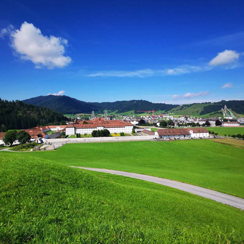 Cette charmante petite ville d’un peu plus de 16’000 habitants (située à 882 mètres d’altitude) m’était complètement inconnue il y a deux mois. Pourtant, quand j’y suis arrivée, j’ai eu l’étrange intuition que c’était là où j’allais habiter. Est-ce à cause des montagnes ? du lac de Sihl juste à côté ? du petit téléski qui laisse imaginer des hivers blancs ? de la tranquillité de la petite ville très fréquentée par les touristes et les pèlerins ? ou alors est-ce à cause de l’immense monastère, de son Abbaye bénédictine et de sa Vierge Noire qui donnent envie de s’arrêter pour écouter l’histoire ? C’est probablement un cocktail de tout cela… On verra…