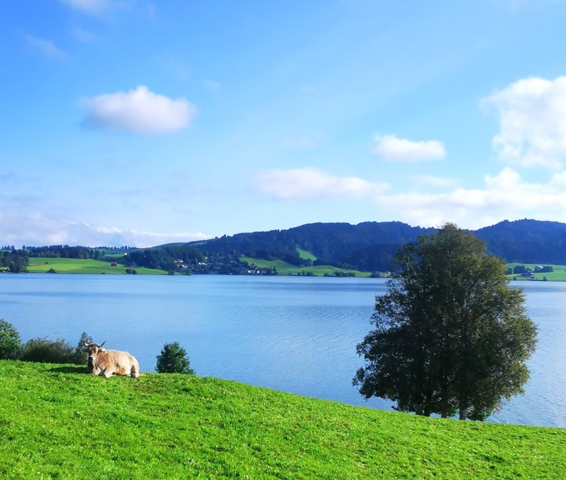 Allez, revenons sur terre, admirons ces brins d’herbe bousculés par le vent, écoutons Éole s’engouffrer dans les arbres derrière moi. Un voilier gonfle sa toile sur le lac et glisse en silence. Les cloches du monastère n’en finissent plus de sonner. Un dernier regard vers ces deux belles vaches brunes… et dire que ce sont elles que l’on accuse d’être la cause de bien des malheurs… C’est comme si on ne connaissait plus la direction du bon sens. Une pie dans l’herbe verte me rappelle mon tableau préféré de Monet.