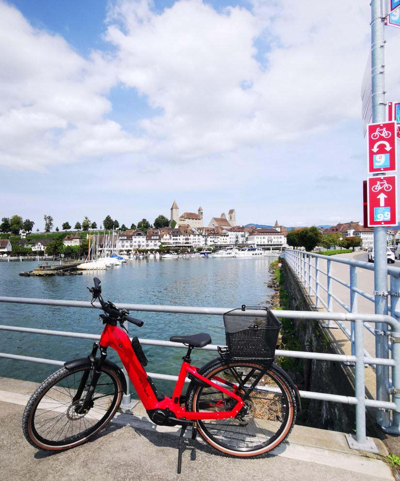 Connaissez-vous la route du cœur ? Je n’en savais rien il y a 4 jours… Cela a bien sûr éveillé ma curiosité quand on m’a dit qu’elle passait par Einsiedeln. Elle part de Lausanne et va jusqu’à Romanshorn en 13 étapes. Bien heureuse d’avoir enfin un défi à lancer à Véli, j’ai commencé à l’étape 9 : Einsiedeln – Rapperswil – 51 kilomètres annoncés – Parcours bien indiqué, je ne me suis trompée qu’une seule fois, je crois. Pourquoi la route du cœur ? Parce que les nombreuses montées (et descentes bien sûr) sont bonnes pour le cœur ? Ou parce qu’on s’éloigne des grands axes pour admirer des paysages coups de cœur en faisant de grands détours par rapport à la voie directe ? Par monts et par vaux, Véli a bien accompli ce premier grand défi me faisant me sentir toute légère. J’ai choisi de rentrer via Pfäffikon par une voie plus directe. Cependant, voyant la batterie baisser dangereusement, j’ai eu quelques frayeurs dans la longue montée de retour sur ma colline. Ouf, arrivée au sommet à St Meinrad, j’étais à 1%. Sauf que le restaurant où j’espérais recharger la batterie est fermé le mercredi. Heureusement qu’il y en avait un autre au bas de la grande descente avant de traverser le pont du Diable d’Egg. Ainsi j’ai pu me désoiffer pendant que Véli s’abreuvait lui aussi à une borne électrique. Ainsi revitaminés, je n’ai pas eu besoin de souffrir dans la dernière grande montée vers Einsiedeln. Eh oui, je ne suis pas très courageuse à vélo, j’ai toujours préféré marcher ou courir. C’est vrai qu’on va plus loin à bicyclette. Donc si j’y prends goût, c’est bien grâce à la magie de l’électricité…
